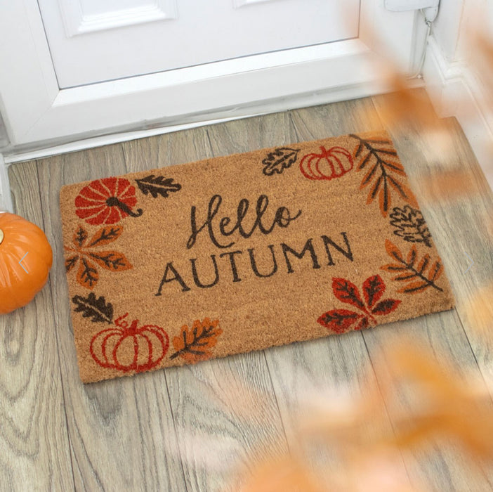 This charming coir doormat features an autumn leaf and pumpkin design with 'Hello Autumn' text that is a great way to greet the colder weather.