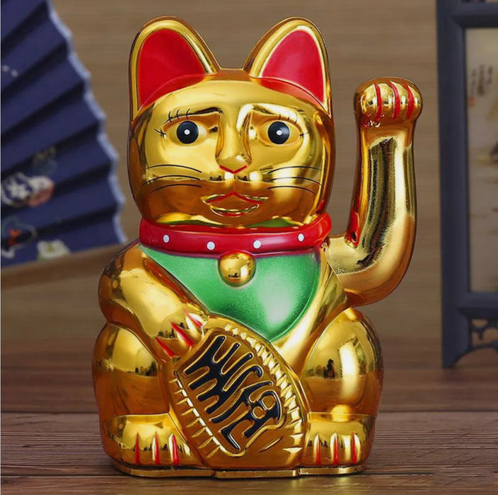 This Gold Chinese Lucky Waving Cat invites money, property, wealth, business opportunities and friends to whoever owns one, waving in good fortune for its owners.