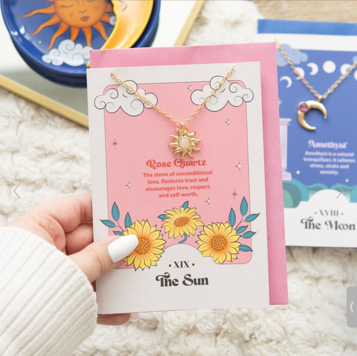 The perfect gift for expressing love and gratitude. This stainless steel necklace features a sun pendant with a rose quartz crystal. Presented on a colourful greeting card inspired by 'The Sun' tarot card designs, and text describing the benefits of rose quartz: "The stone of unconditional love. Restores trust and encourages love, respect and self-worth". Pink envelope included for easy gifting.