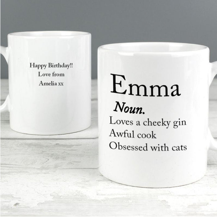 Personalise this mug with any name, and 4 points below. The word "noun" is a fixed part of the design and does not need to be added to the text when ordering.