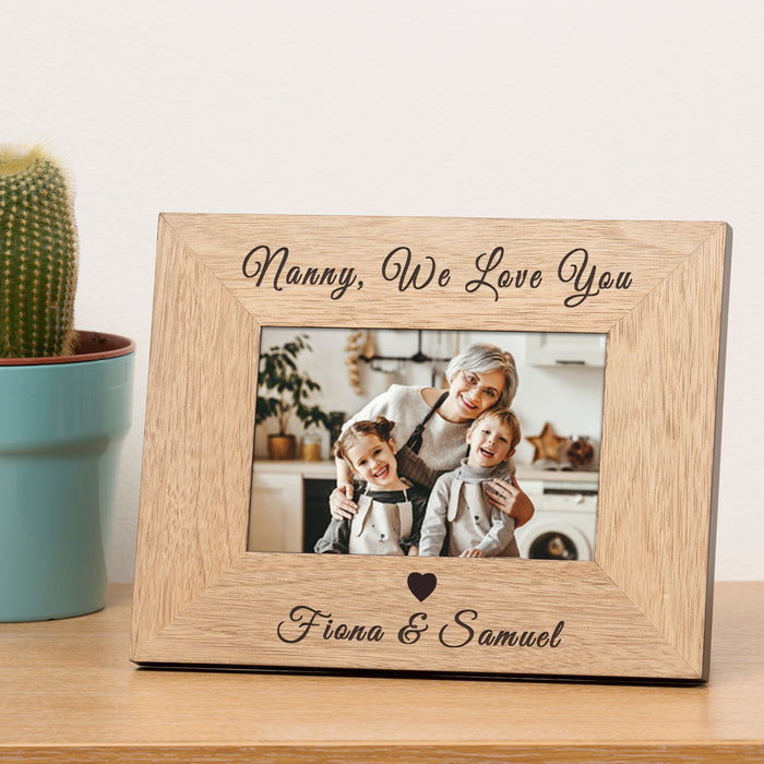 A high quality oak veneer wood photo frame. The top is engraved with Nanny and along with I or We Love You. The bottom of the frame is personalised with a heart and a name/s.
