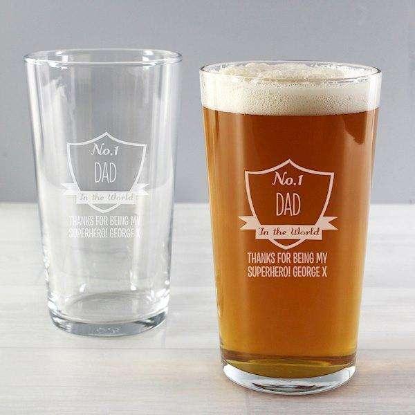 Personalise this No.1 Shield Pint glass with a name/role up to 7 characters, and 2 lines of 20 characters for a message at the bottom. All text will be fixed UPPERCASE.