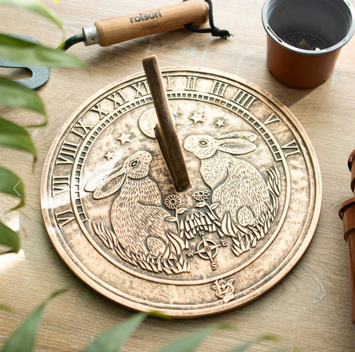 This terracotta sundial by Lisa Parker features a beautiful Moon Gazing Hare design that's brought to life with a rustic, bronze-like finish.