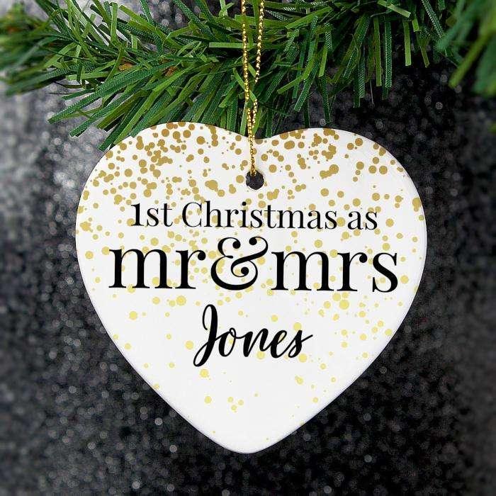 Celebrate a special first Christmas as a married couple with this Personalised Mr and Mrs 1st Christmas Ceramic Heart Decorations Decoration.