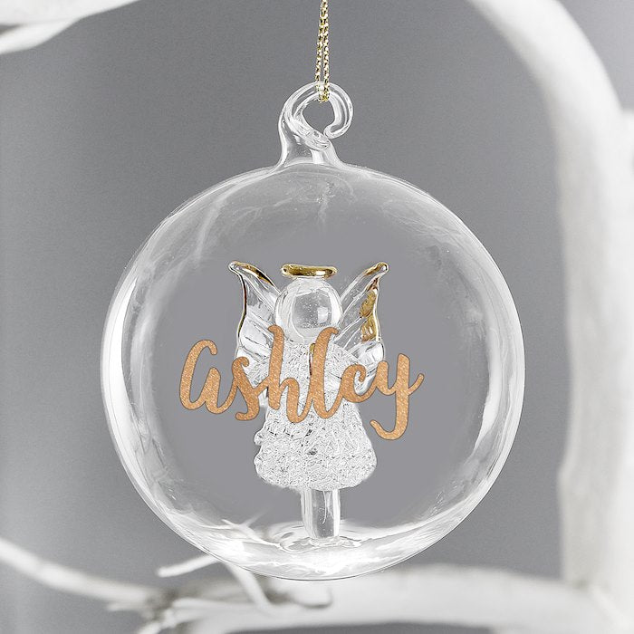 Personalised Gold Glitter Name Angel Memorial Glass Christmas Bauble