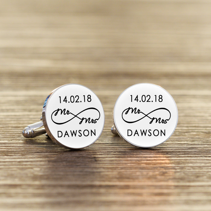 Personalised Mr & Mrs Infinity Wedding Round Cufflinks - White