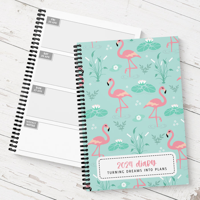 The week-to-view diary covers a full year from January to December. Before the calendar begins, there are pages for yearly resolutions, important contacts, notes and birthday/gift tracking.