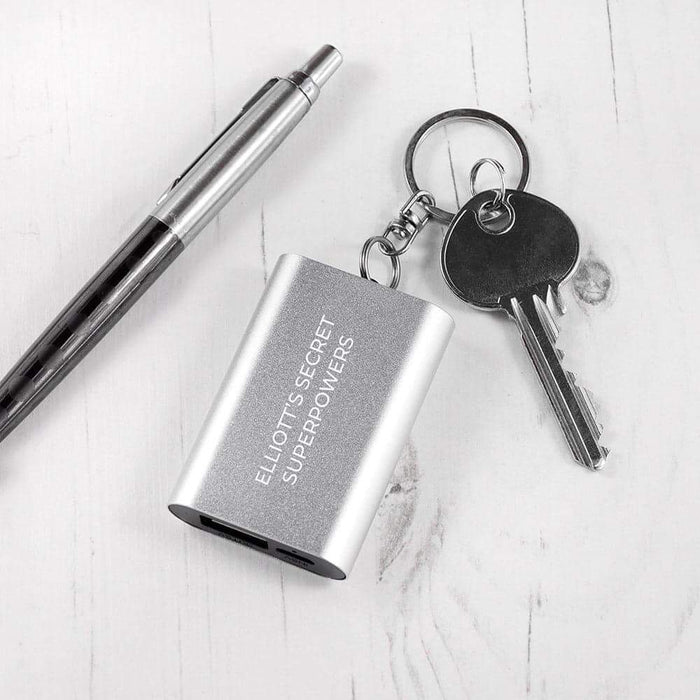 Imagine you're out and about and suddenly notice your phone is dying and you've forgotten your regular powerbank! What to do? A convenient, compact 1000 mAh powerbank, made with aluminium is attached to a keychain so it's convenient and easy to take wherever you go.