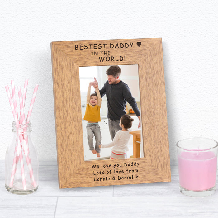 A stylish personalised oak finish photoframe. The top of the frame is engraved "Bestest Daddy in the World", the bottom of the frame is left free for your own personalised message up to 120 characters 3 lines 40 characters each line.