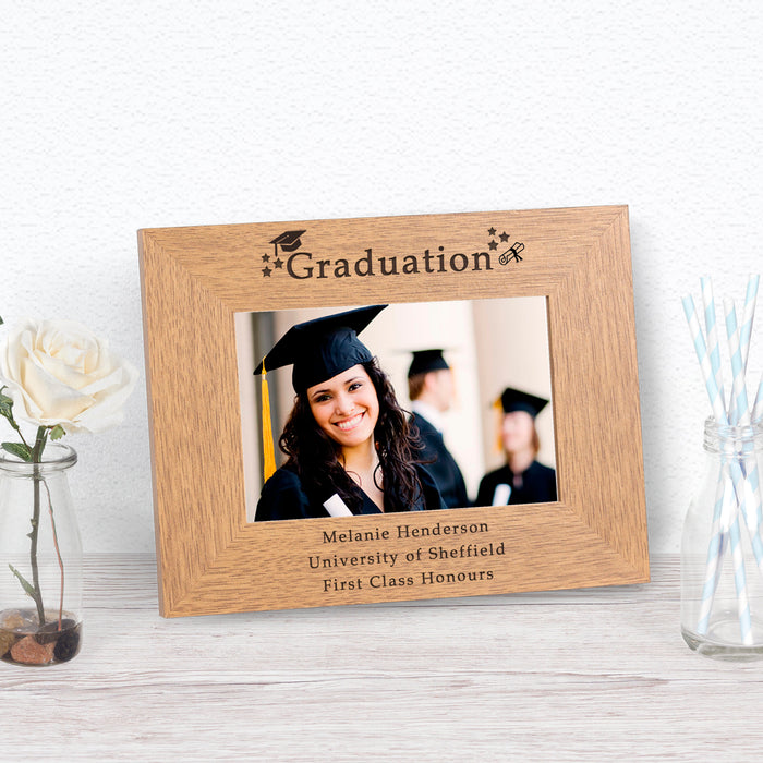 A high quality finish oak veneer wood frame. The top is engraved with "Graduation", the bottom of the frame is left free for your own personalised message.