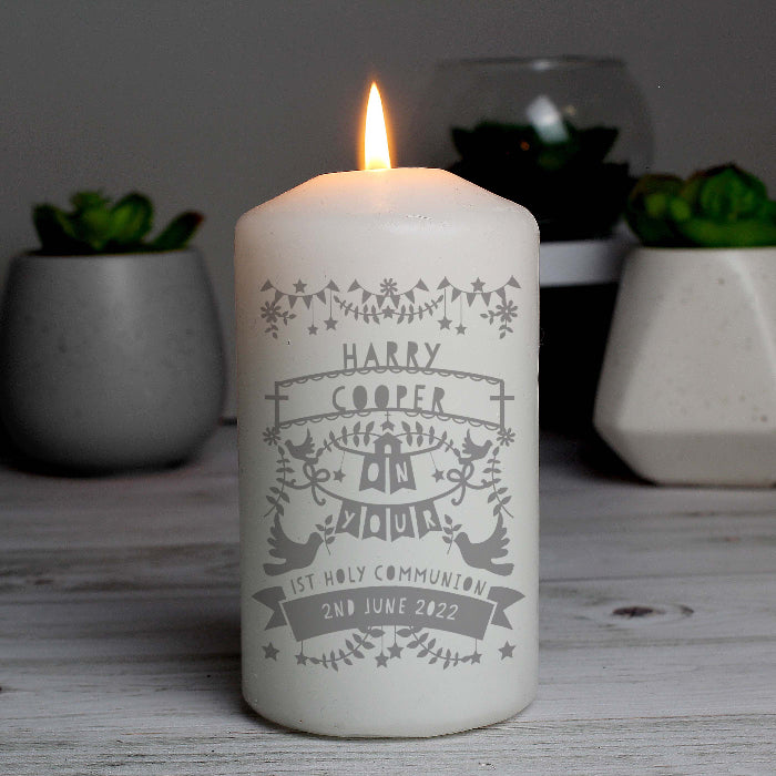 Personalised Grey Papercut Style 1st Holy Communion Pillar Candle