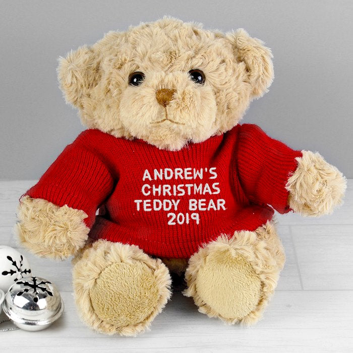 Personalise this fabulous bear with any name up to 13 characters, please include the 's if required. The wording 'Christmas Teddy Bear (Year of purchase)' is standard text.
