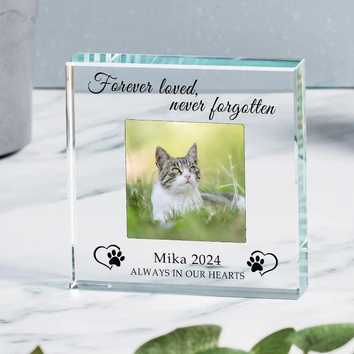 Personalise this stunning and touching 'Forever loved, Never Forgotten, Always in Our Hearts' glass token with your choice of text and a favourite photo to make a unique and thoughful gift to remember a beloved cat.