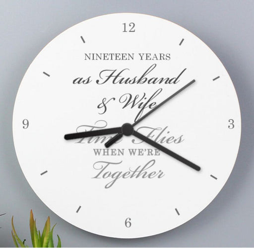 This clock makes a perfect 19th Anniversary gift.The clock reads; NINETEEN YEARS as Husband & Wife Time flies when we're togetherBattery not...