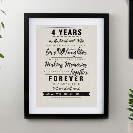 This Anniversary Framed Print makes a perfect 4th Anniversary present.The text reads 4 Years as Husband and WifeOUR DAYS ARE FILLED WITHlove &...