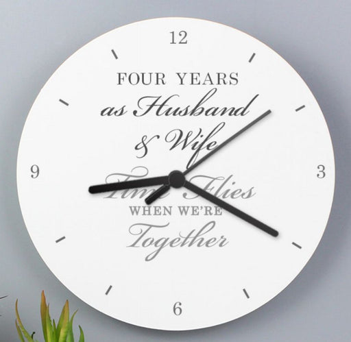 This clock makes a perfect 4th Anniversary gift.The clock reads; FOUR YEARS as Husband & Wife Time flies when we're togetherBattery not incl...
