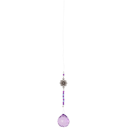 This beautiful, purple faceted crystal hangs on a clear thread decorated with matching beads and a silver tone lotus flower charm. Perfect for catc...