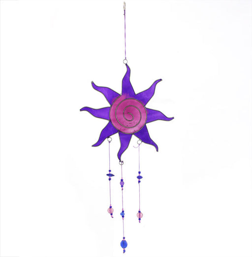 Purple sun suncatcher with beads. This product is ethically sourced. Hang in a window to reflect the light and bring the sun catcher to life.