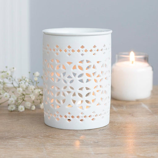 This white matte cut out oil burner will look great in any home. Once a lit tealight is placed inside it casts pretty shadows thanks to the cut out...