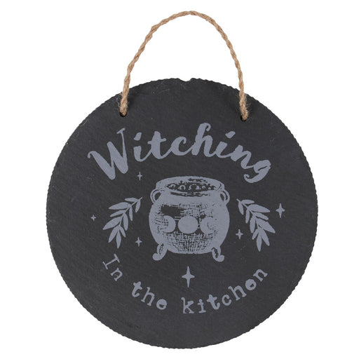 This unique circular slate hanging sign features a 'Witching in the Kitchen' design complete with a cauldron and triple moon illustration.