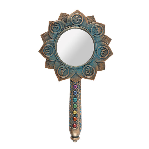 This lotus flower hand mirror is accented by symbols and gems representing the seven chakras and is finished with an antique bronze effect. Makes a...