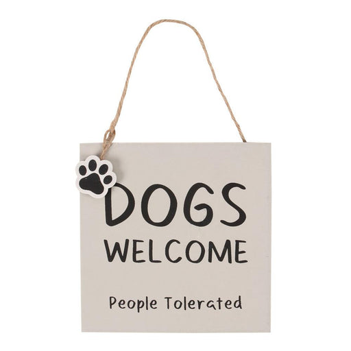 Humourous hanging sign designed with dog people in mind. The sign reads 'Dogs Welcome...People Tolerated' and features a mini paw charm for a decor...