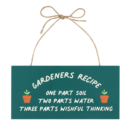 A hanging MDF sign that makes a great gift for a wide variety of gardeners and green thumbs. Features text that reads, 'Gardeners Recipe. One part ...