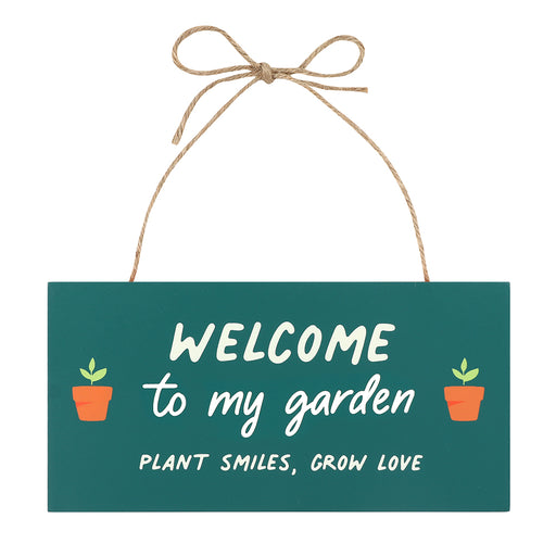 A hanging MDF sign that makes a great gift for a wide variety of gardeners and green thumbs. Features text that reads, 'Welcome to my garden. Plant...