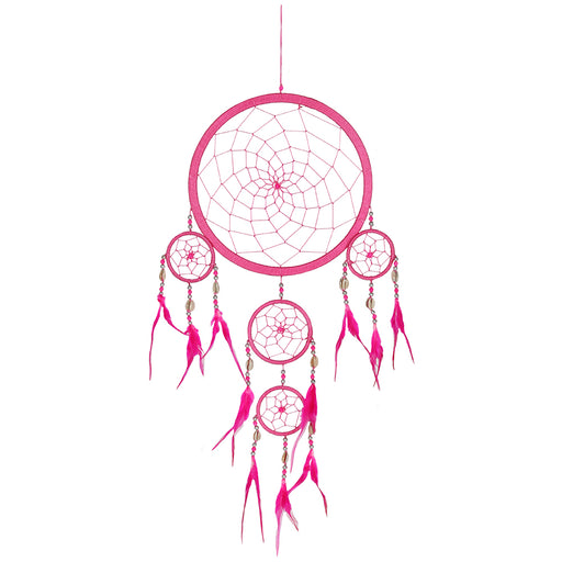 This vibrant dreamcatcher features 5 hot pink hoops and webs finished with beaded tassels. Shell accents finish off this fun, feathered style. Larg...