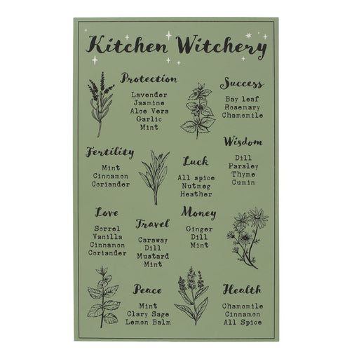 Master spells and potions with the help of this handy 'Kitchen Witchery' wall plaque feauturing common plants and their associations with positive ...