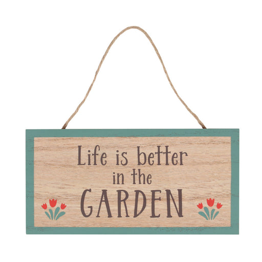 This hanging 'Life is Better in the Garden' wooden sign is the perfect finishing touch for a well-loved garden.