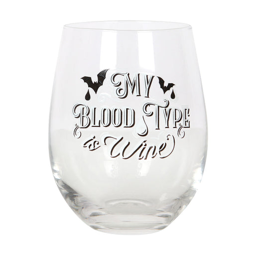 This stemless wine glass features 'My Blood Type is Wine' text with gothic bat designs. Perfect for sipping red wine after a long night of mischief...