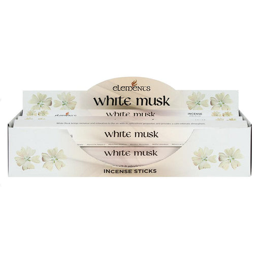 A box of 6 packs of White Musk fragranced incense sticks by Elements. Each pack contains 20 incense sticks.