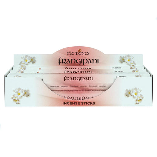 A box of 6 packs of Frangipani fragranced incense sticks by Elements. Each pack contains 20 incense sticks.