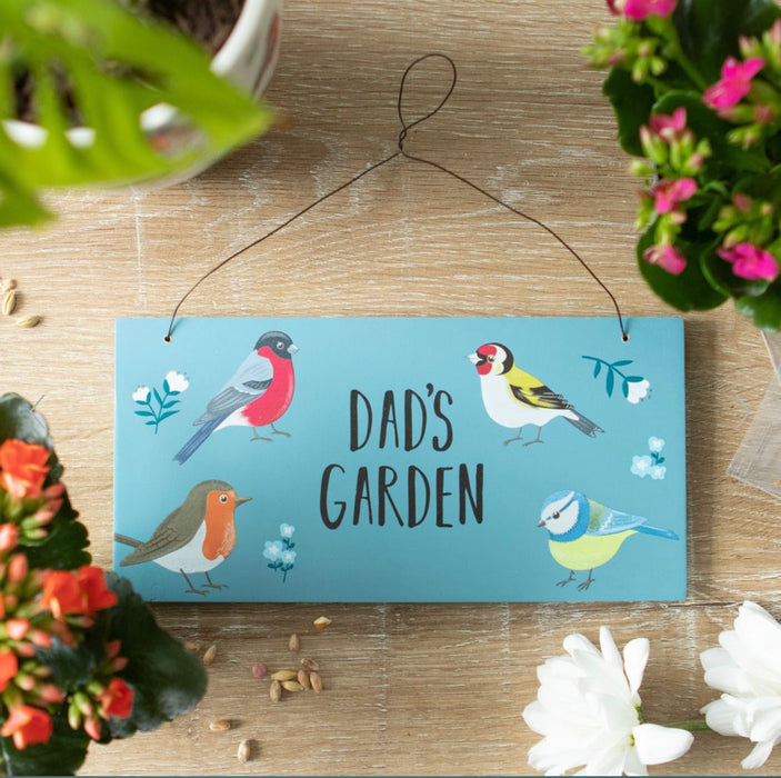 Features 'Dad's Garden' text with 4 adorable illustrations of garden birds commonly found in British gardens (Blue Tit, Robin, Goldfinch and Bullfinch).