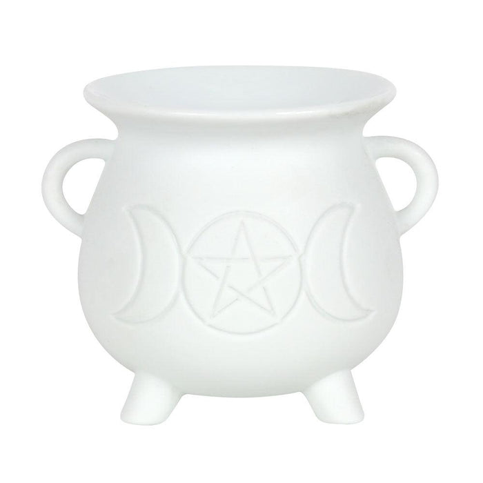 This white cauldron burner features an engraved triple moon on the side and can be used to warm wax melts or diluted fragrance oils to beautifully fragrance your space.