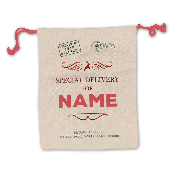 Personalised Christmas Presents Sack with Special Delivery Design, Personalise with Any Name