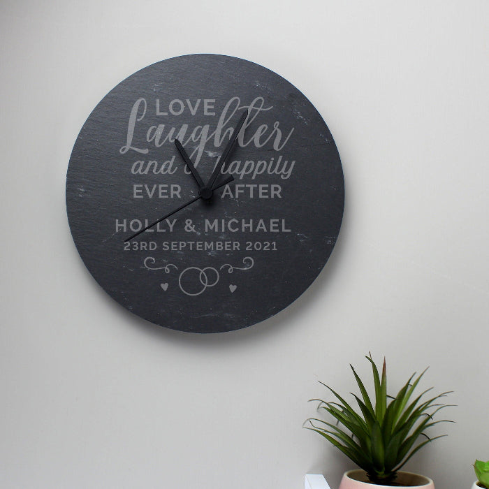 This Love Laughter Slate Clock can be personalised with up to 2 lines of text