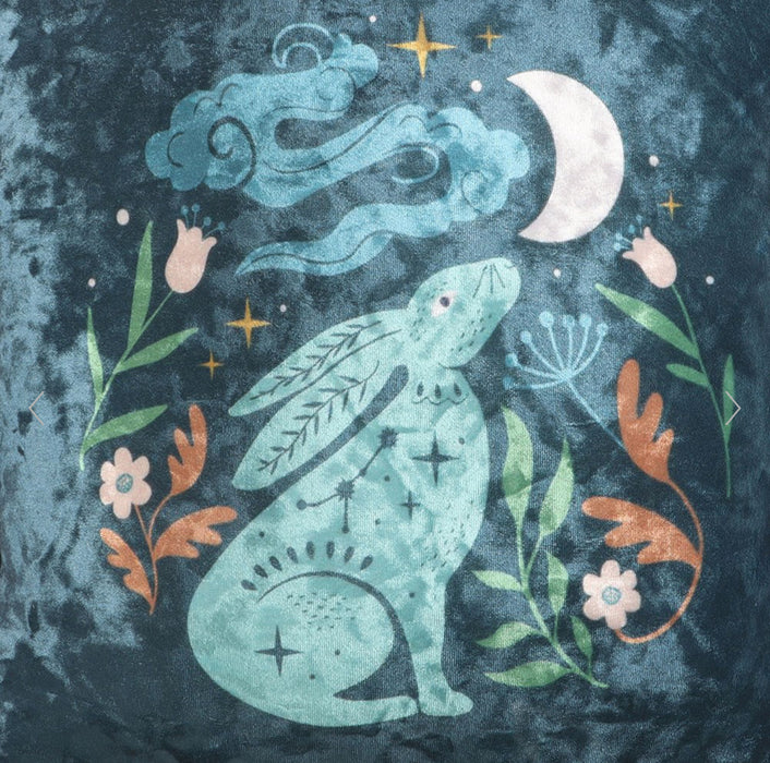 This velvet cushion comes in a luxurious steel blue colour and features an elegant moon gazing hare illustration. Ideal for those who appreciate unique home accents with a subtle touch of magic.