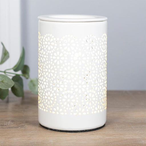 View full detailsThis elegant, electric oil burner lights up to showcase a lacy circle pattern and is compatible with both scented fragrance oils and wax melts. To ...