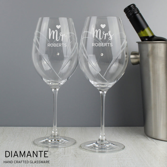 Personalise this set of Hand Cut Diamante Heart Wine Glasses with a surname up to 12 characters long.