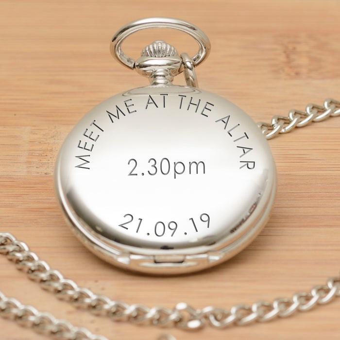 High quality silver finish pocket watch with quartz movement and 14 inch chain. The top is engraved "MEET ME AT THE ALTAR", add a time, date or message to complete the design.