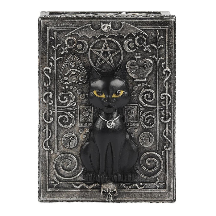 A resin box with raised silver pentagram, tarot card, astrological and bat details and a black cat in the center. This gothic style is perfect for holding small tarot card decks, crystals, herbs and other small objects for safe keeping. Inner storage space measures approximately 8cm x 12cm x 3cm.