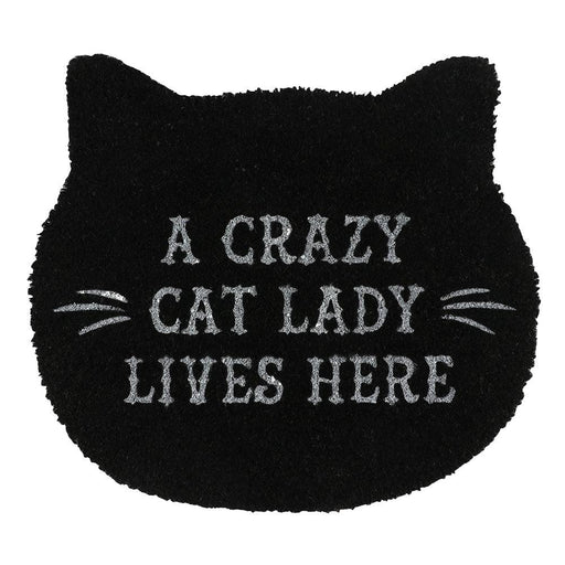 A black coir doormat shaped like a cat face with 'A Crazy Cat Lady Lives Here' text and printed whiskers. Part of our Black Magic range of gothic g...