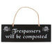 This humorous hanging sign features 'Trespassers will be composted' text accented by skulls and crossbones.