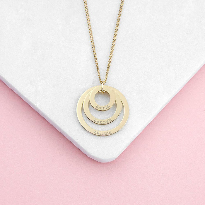 This charming gold plated necklace is made with a set of three rings, each of which is engraved with a special name, date or message.