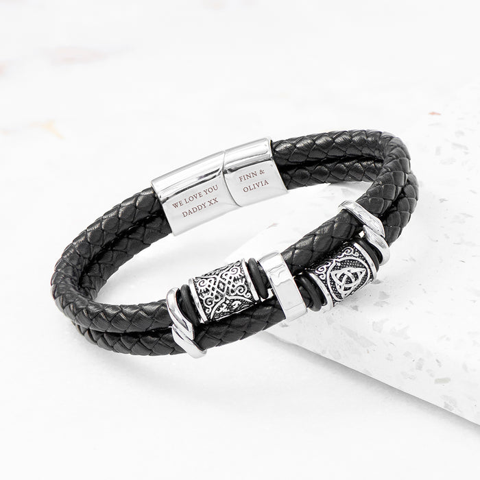 A bracelet with a bit of an edge, our Personalised Men's Celtic Knot Leather Bracelet is ideal for that stylish man in your life. Made from black leather, this bracelet features an intricate Celtic knot design. Great for both day-to-day use or special nights out, this gorgeous bracelet is the perfect way to add a touch of style to any outfit. A luxurious gift that's perfect for any occasion. Every personalised bracelet comes in a gorgeous gift box, ready to gift to him!