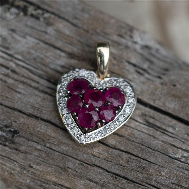Rubies and diamonds are pave set into a 9K yellow gold heart pendant which hangs from a solid 9K yellow gold curb chain. The centre of the pendant feature 6 natural, deep red rubies which are surrounded by 20 individual brilliant cut diamonds, with a total stone carat weight of 0.06ct. The chain measures 18 inches and also feature an extender chain.