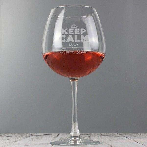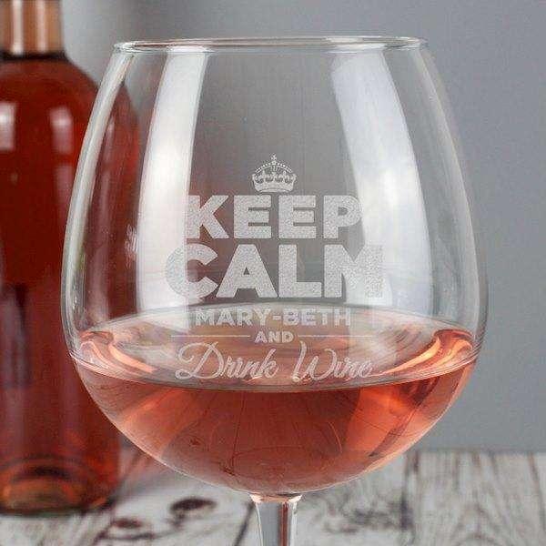 A personalised Keep Calm Bottle of Wine Glass? Yes it exists! It's perfect for all the wine fanatics.