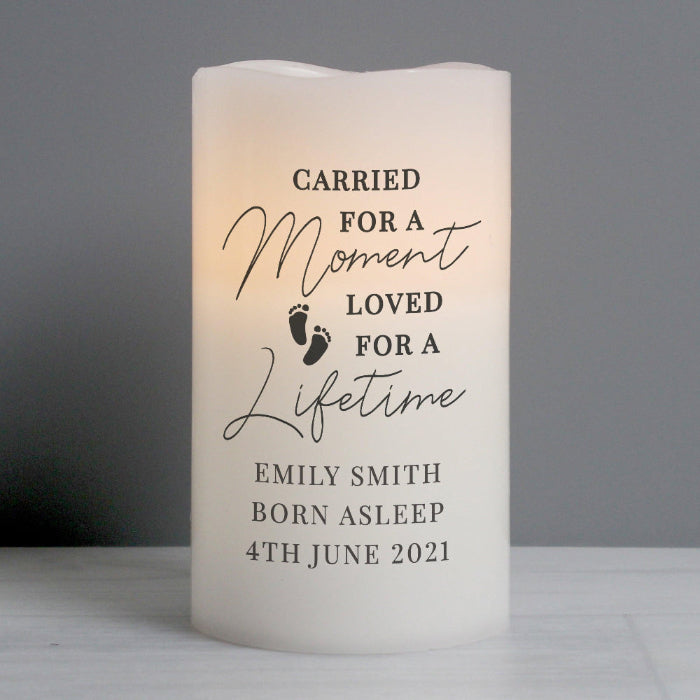 • Personalised 'Carried for a moment, loved for a lifetime' LED memorial candle.